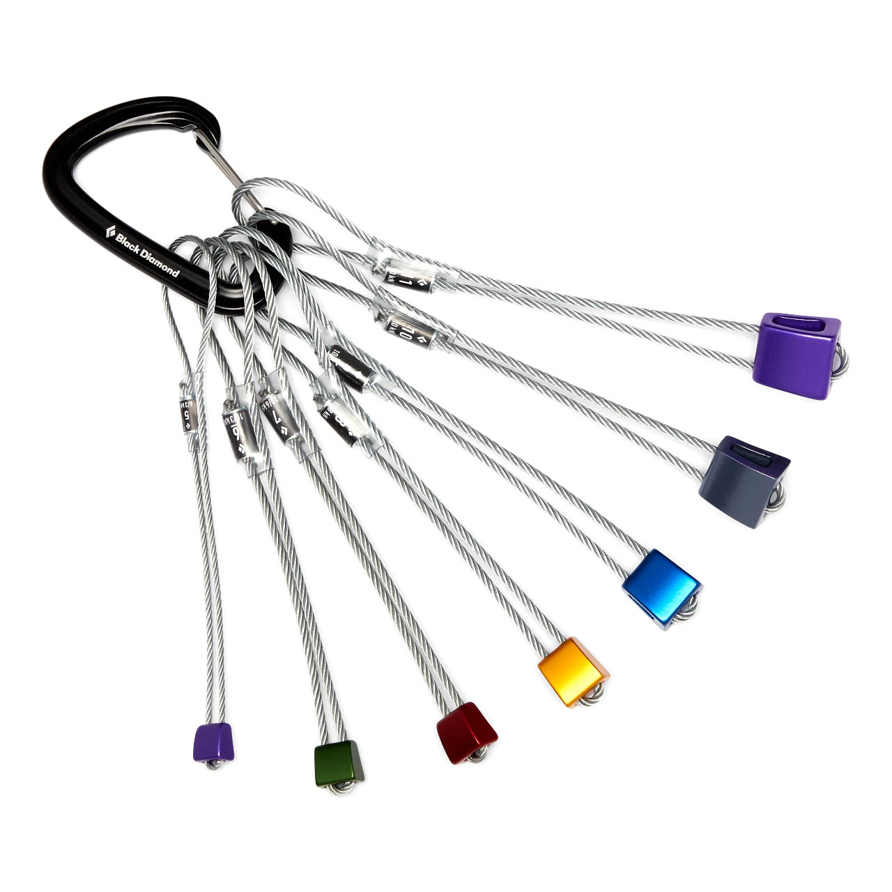 Ein Set der wichtigsten Klemmkeilgrößen (7 Stück)zum Alpin Klettern, inklusive 1x Oval Wire Karabiner.
